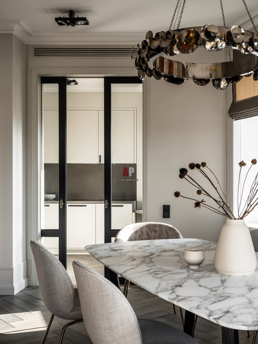 Столовая отделена от кухни раздвижными дверями в обрамлении из черного дерева. Дверные ручки, Formani, поставщик EMPORIO.ru