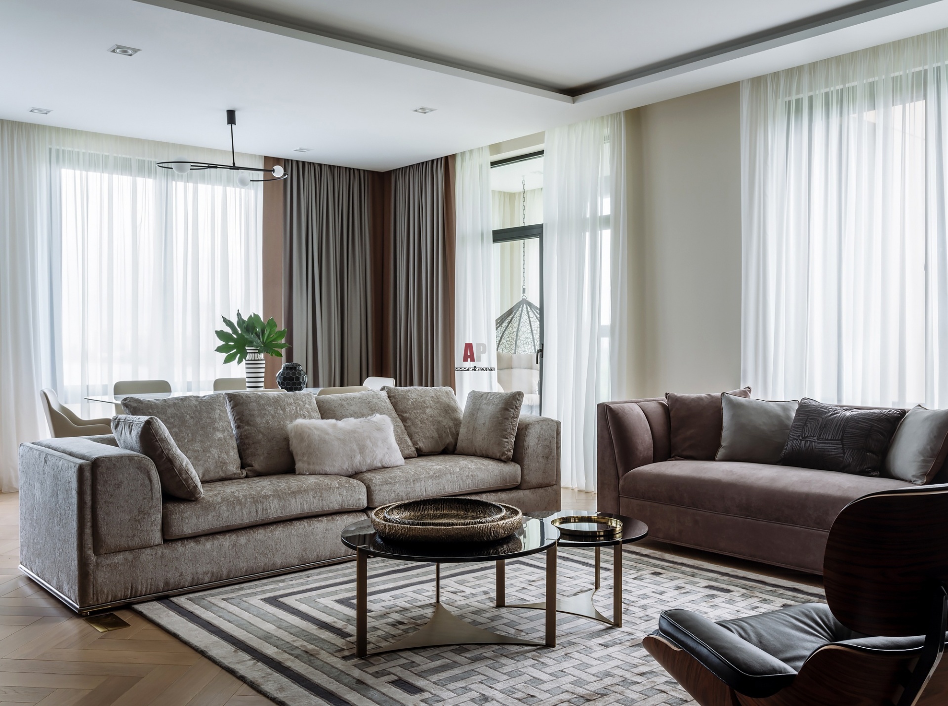 В квартире 12 окон в пол, и она буквально купается в солнечном свете. Диваны, Gramercy Home. Шезлонг, Vitra. Журнальные столики, Garda Decor.