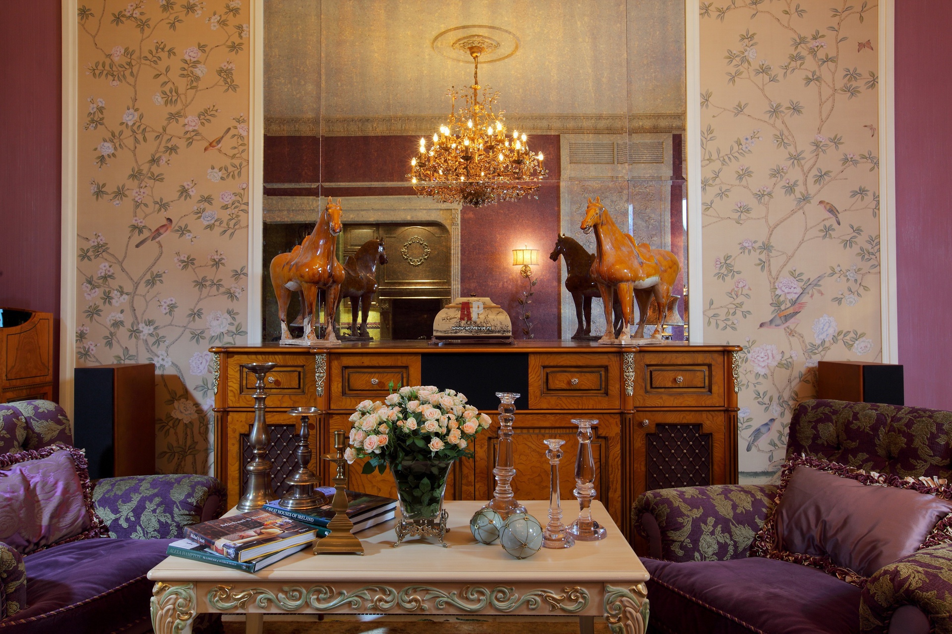 Декор интерьера гостиной. По обе стороны от зеркала – панно из обоев ручной работы. Под ними – буфет из полированного дерева с красивой фактурой.