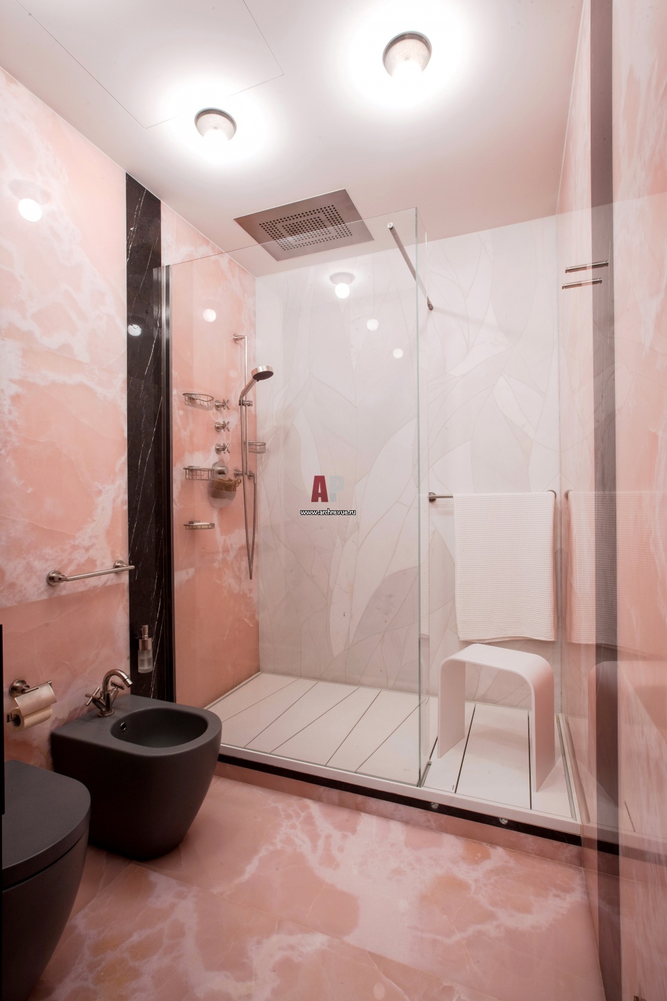 Интерьер хозяйской ванной комнаты в современной квартире. На стенах и полу – оникс редкого розово-грейпфрутового оттенка.