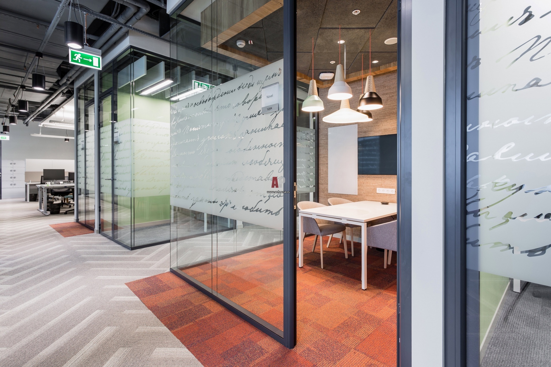 Фото интерьера рабочего пространства с переговорными комнатами. Стеклянные перегородки декорированы орнаментом, который согласовывается с общей декоративной темой «Россия – мировой лидер».