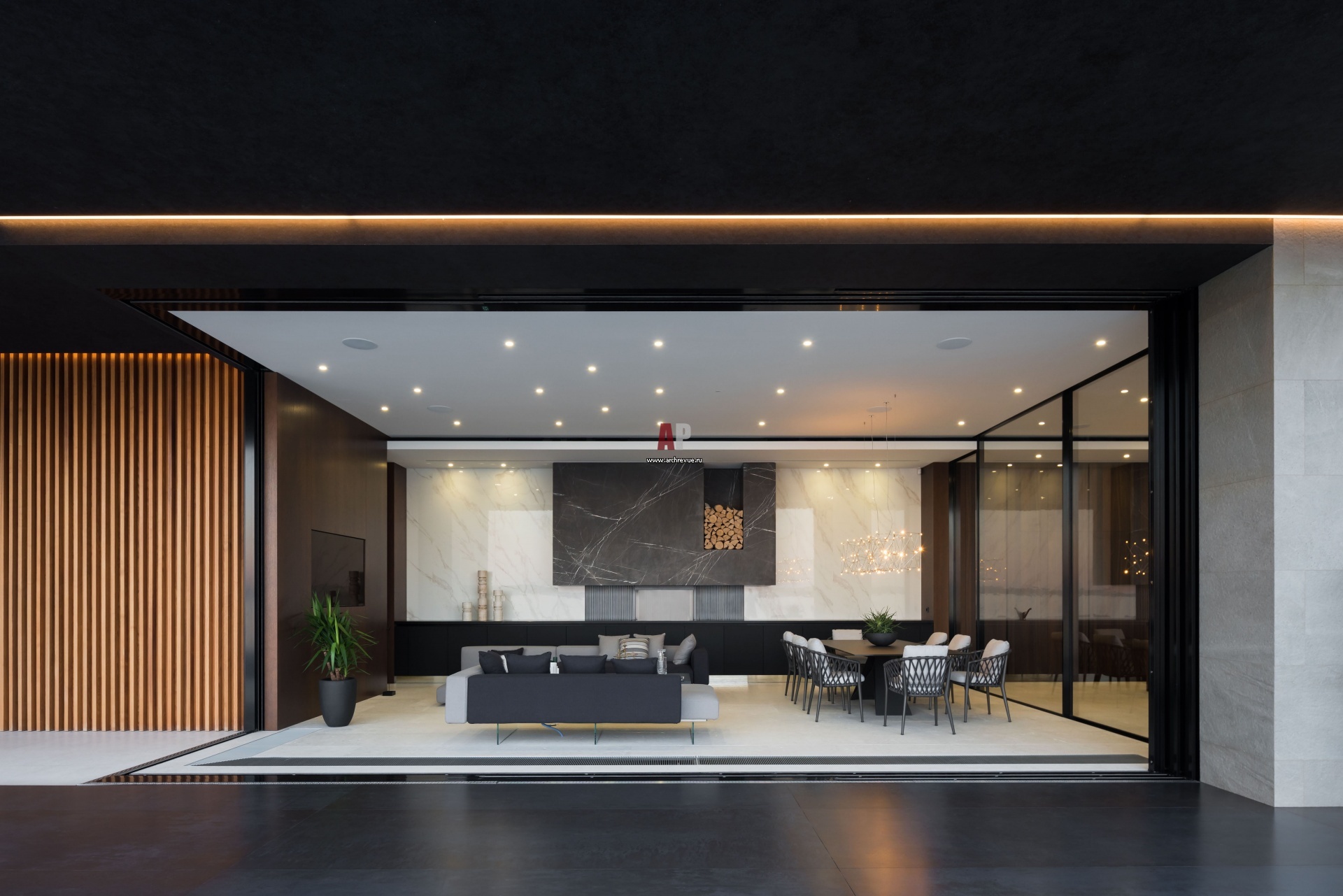 Первый этаж с крытой террасой, мобильной стеклянной перегородкой и бассейном. Терраса оформлена как роскошная гостиная с мраморным камином и диванами Minotti.