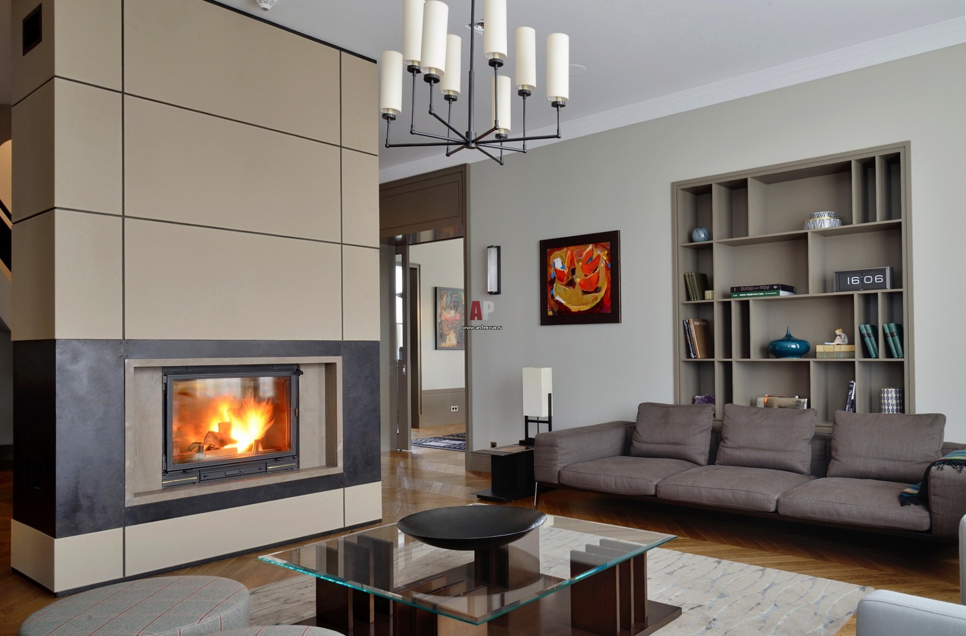 Авторский камин отделяет диванную группу от лестницы. В его отделке сочетается мрамор, металл и панели из кожи. Диван, Flexform. Журнальные столы, Hugues Chevalier и Poliform. Пуф, Marie's Corner. Кресла, B&B Italia.
