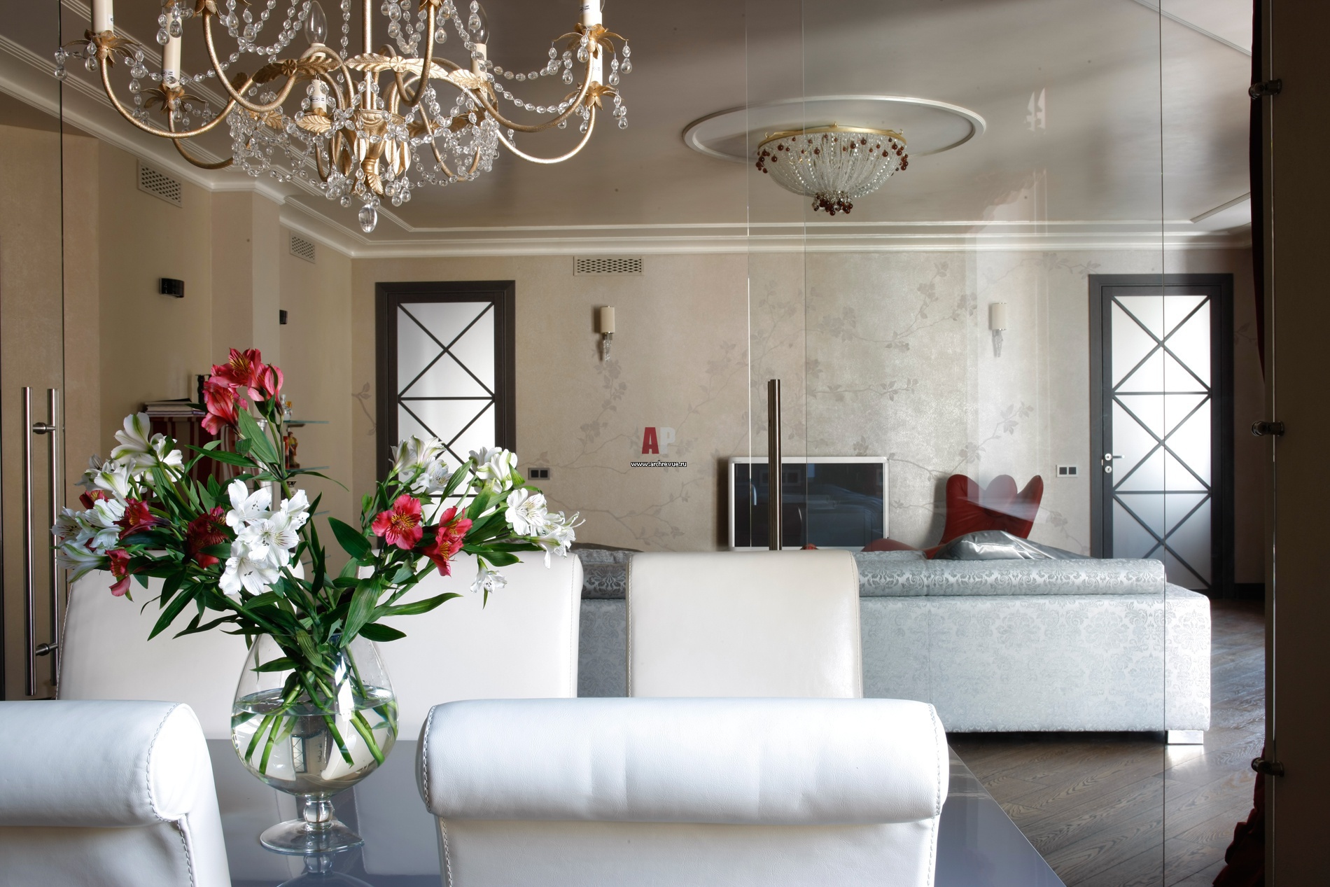 Вид со стороны кухни-столовой на зону гостиной с домашним кинотеатром. Стена, где размещена плазменная панель, оформлена декоративной росписью: по всей поверхности вьется ветка сакуры, изготовление «Линия Декор». Покраски с перламутром визуально расширяют помещение.