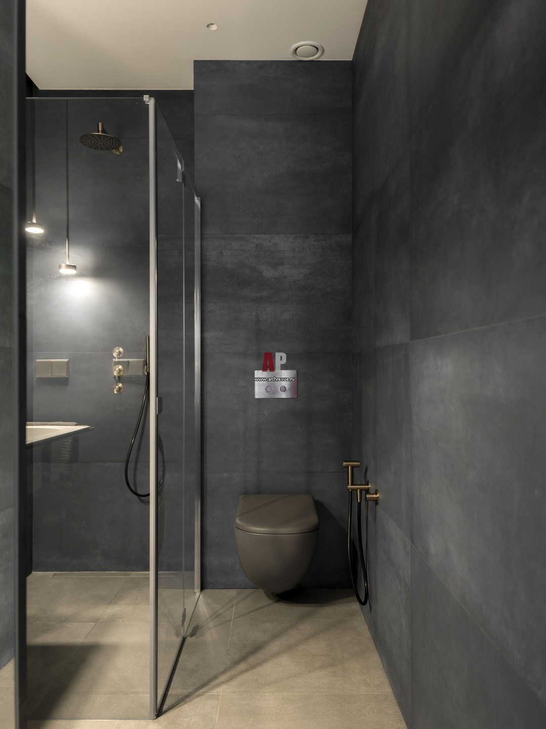 Гостевой санузел. Стены и пол облицованы темным камнем, на его фоне еще эффектнее выглядит стеклянная душевая кабина. Сантехника и мебель, Ceramica Cielo.