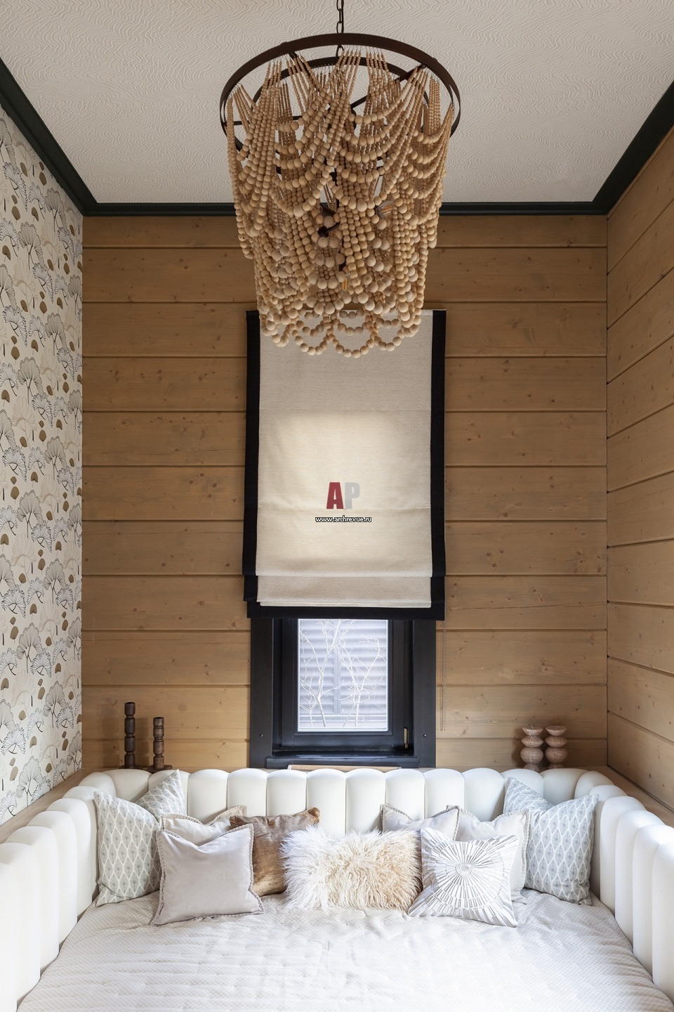 Гостевая спальня на первом этаже. Кровать-топчан сделана на заказ, на нем может разом разместиться семья с двумя детьми. На стенах и потолке – обои, Clarke & Clarke.