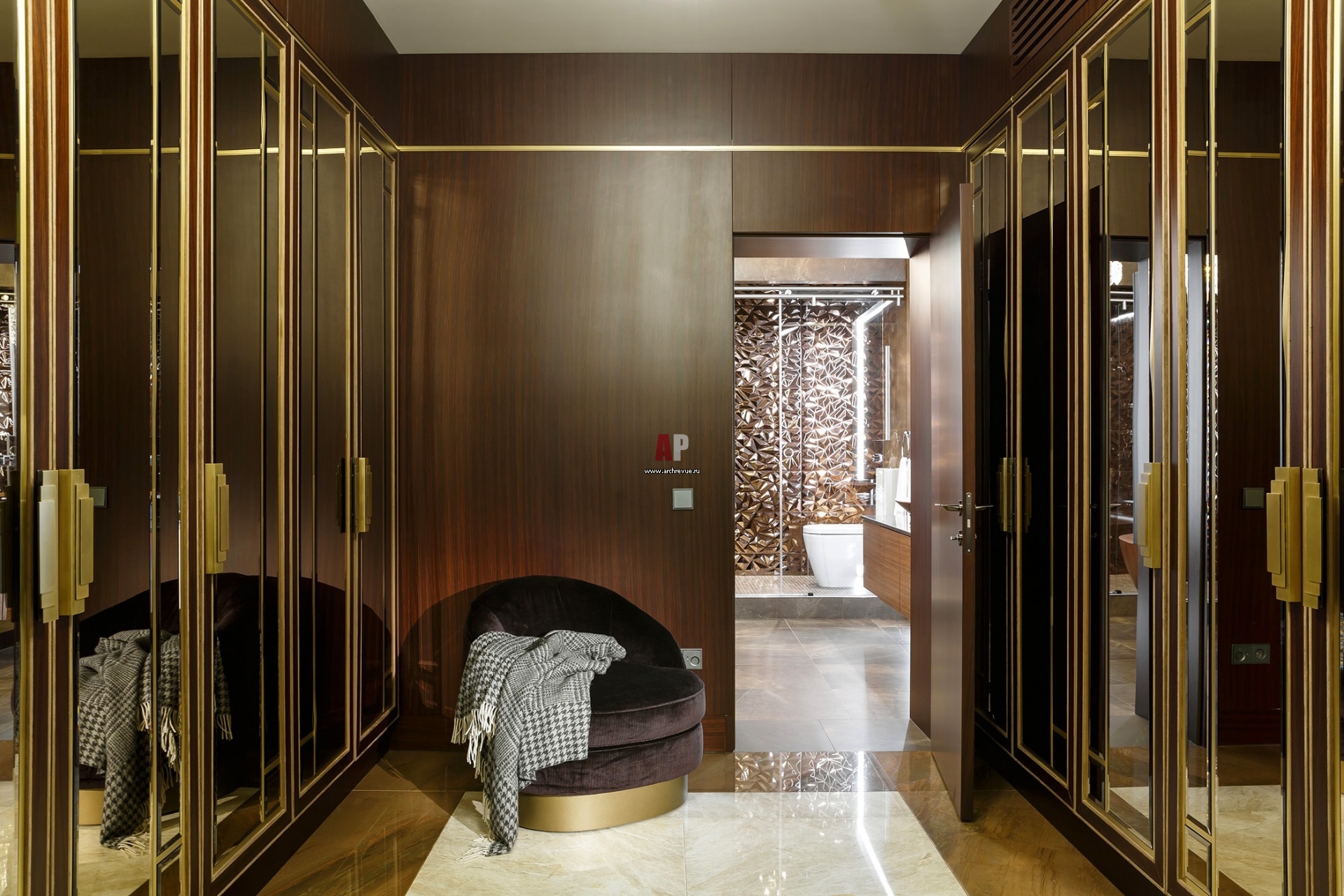 Холл в стиле ар-деко выполнен в палисандре. За дверью – ванная комната.