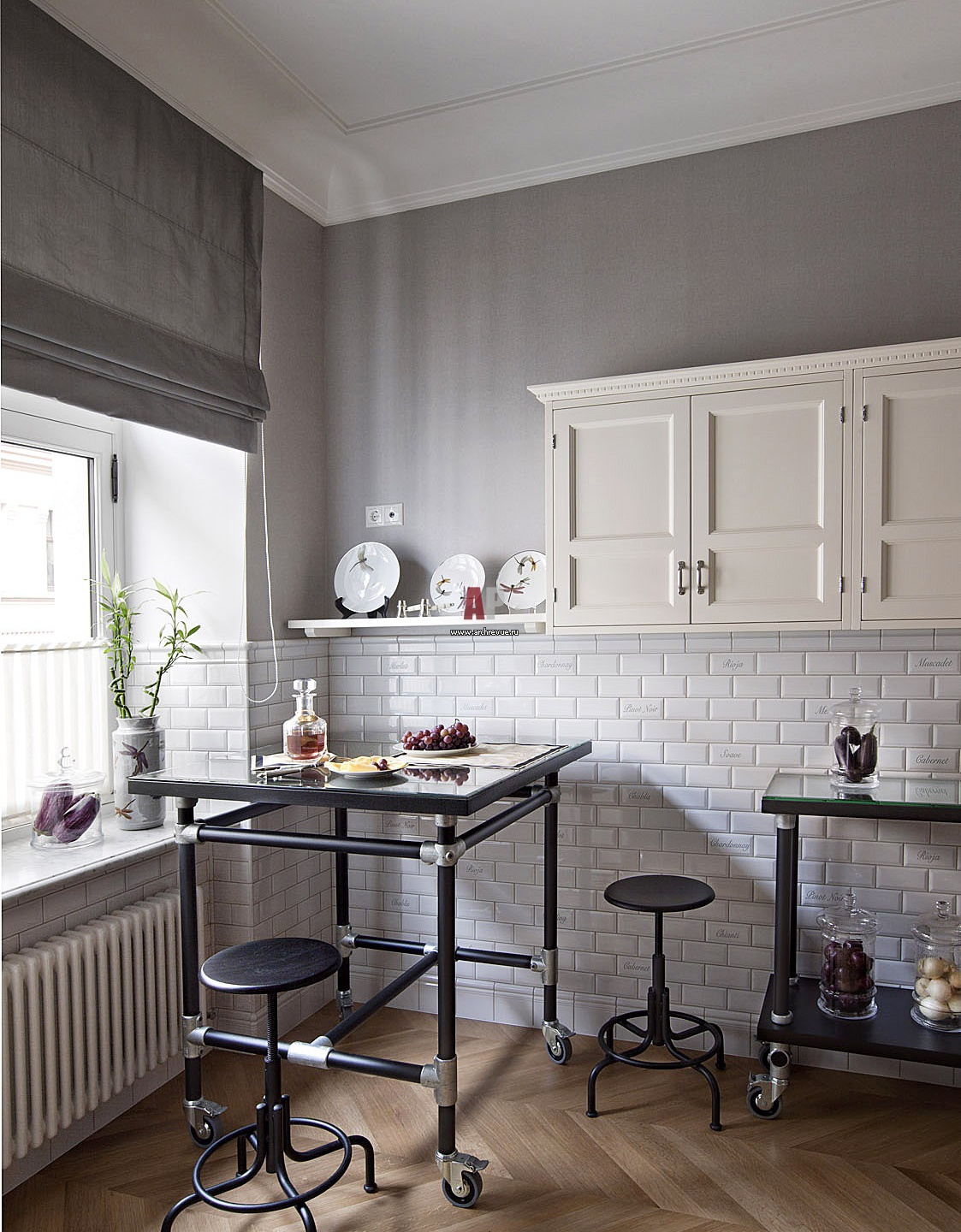 Кухня оформлена в стиле 1920-х годов. Обеденный стол на колесиках, табуреты, Lambert.