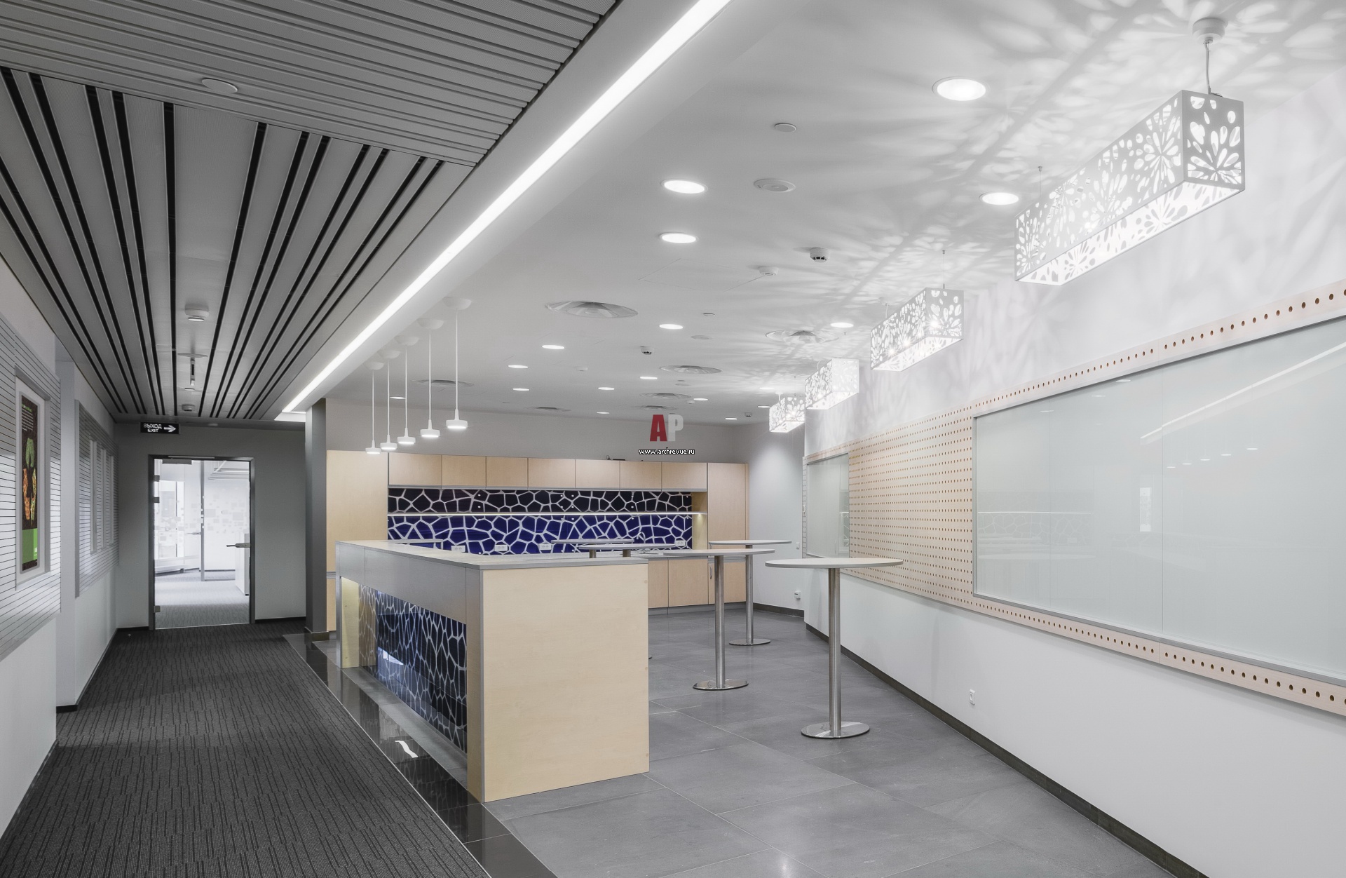 Коридоры работают как коммуникационное пространство. Оно включает в себя открытый coffee point, витрины и информационные стойки различных департаментов, мини-переговорные «купе» и рекреационные пространства у выходов из переговорных.