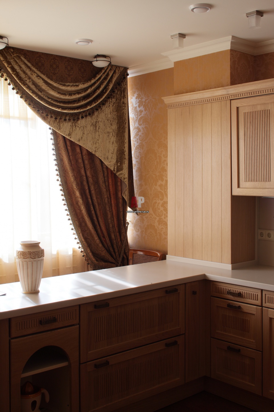 Интерьер кухни. Рабочая поверхность кухни выполнена из камня. Фасады – деревянные.