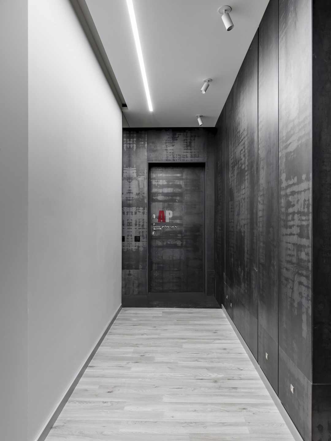 Длинный узкий коридор был абсолютно нефункциональным, в нем невозможно было поставить даже шкаф. Архитекторы предложили обыграть сложную геометрию декоративными средствами и зашили стену металлическими панелями. В металле решено и полотно входной двери.