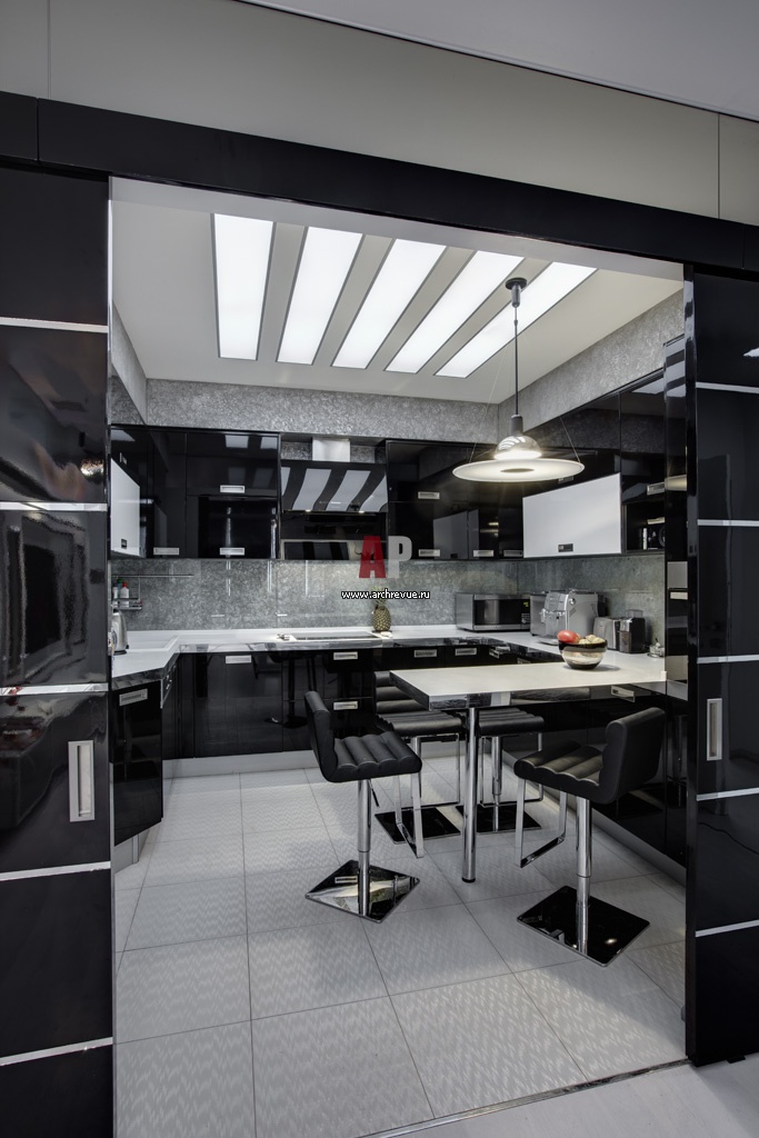 Зона кухни выделена раздвижными перегородками из черного стекла. Стеклянные перегородки смонтированы без видимого каркаса. Кухонный гарнитур в черном глянце. На потолке – геометричная композиция из световых фонарей, изготовление «Неон Проект».