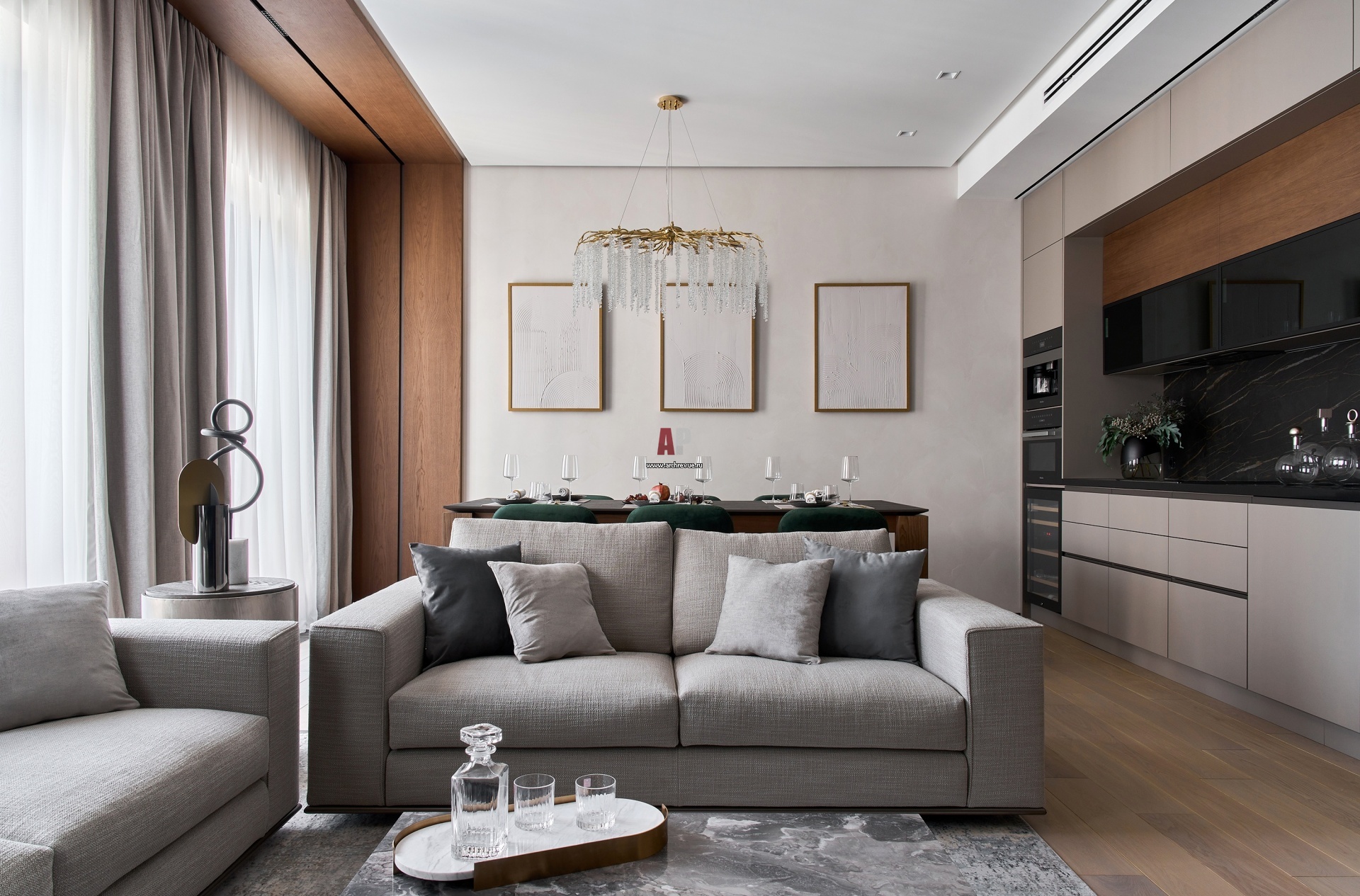 Гостиная-кухня оформлена в монохромной цветовой палитре.