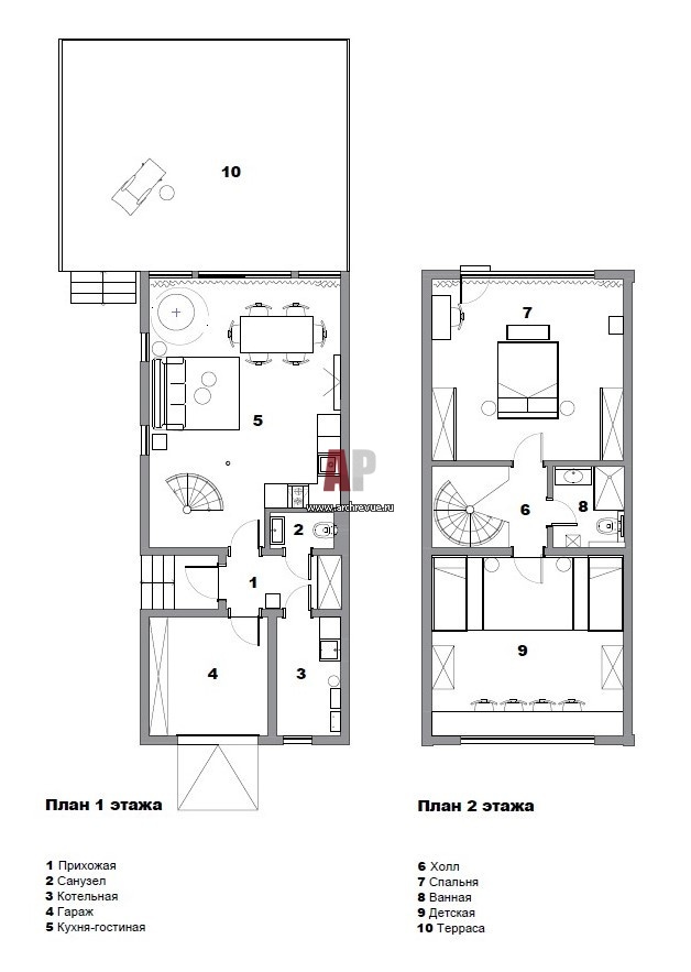 План 1 и 2 этажей небольшого 2-х этажного каркасного дома.