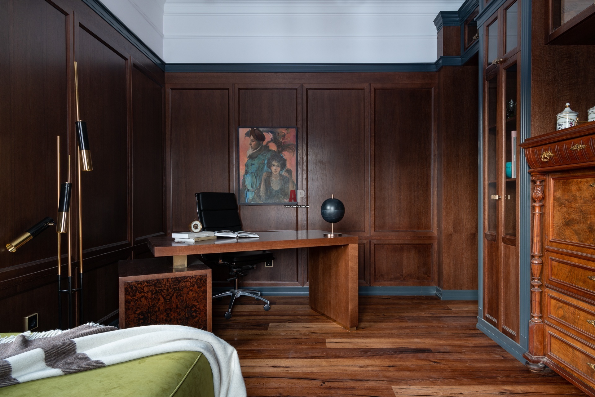 Нормандский дом в Подмосковье. Интерьер кабинета на первом этаже выполнен в традиционном стиле. Панели, стеллажи, шкафы – темный дуб. Письменный стол оформлен панно из корня ореха.