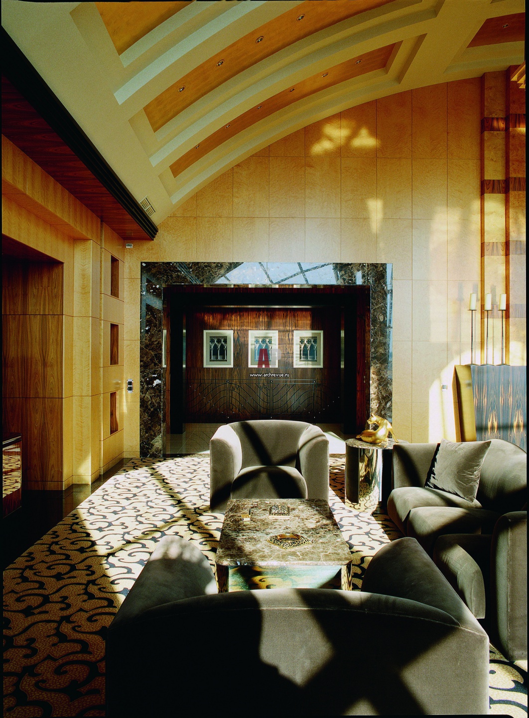 Вид со стороны зоны отдыха на холл. Широкий дверной проем отделан полированным камнем, поставщик «ЛКамень».