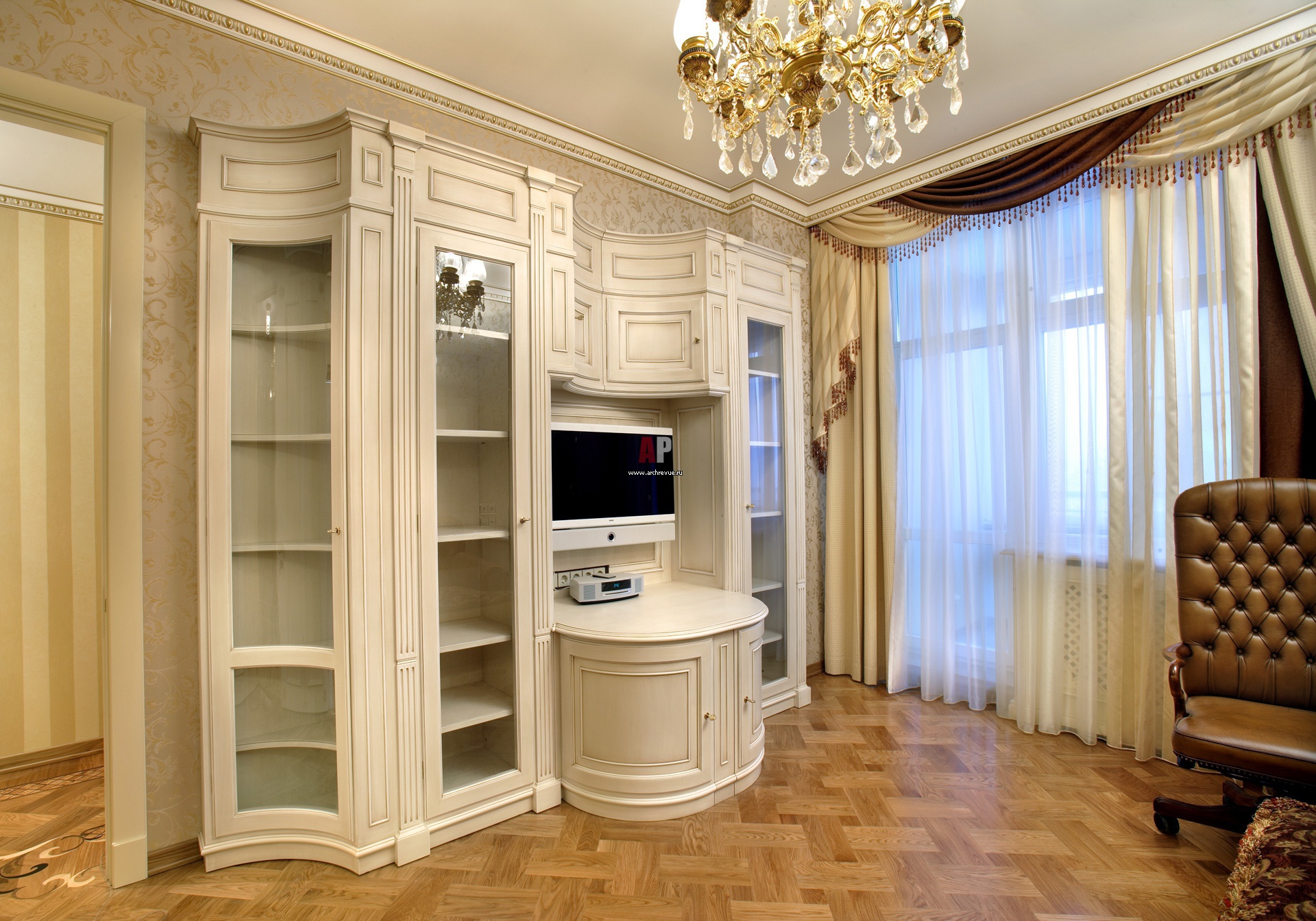 Рабочий кабинет с библиотекой. Мебель цвета слоновой кости.