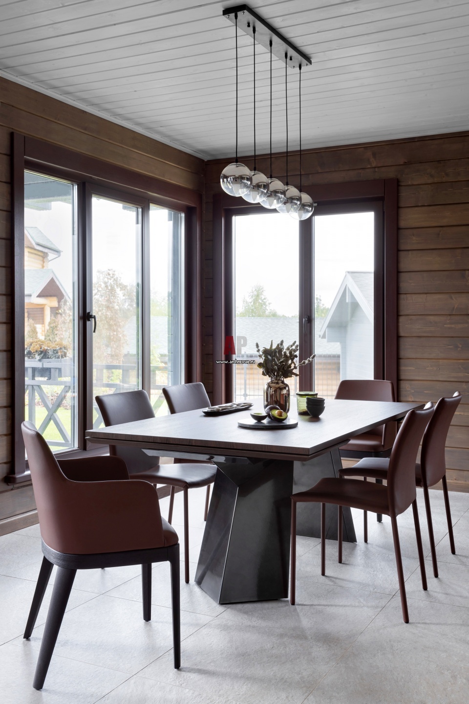 Обеденная зона размещена рядом с выходом на террасу. Обеденный стол и стулья из темно-вишневой кожи, Bontempi. Подвесные светильники, Tom Dixon.