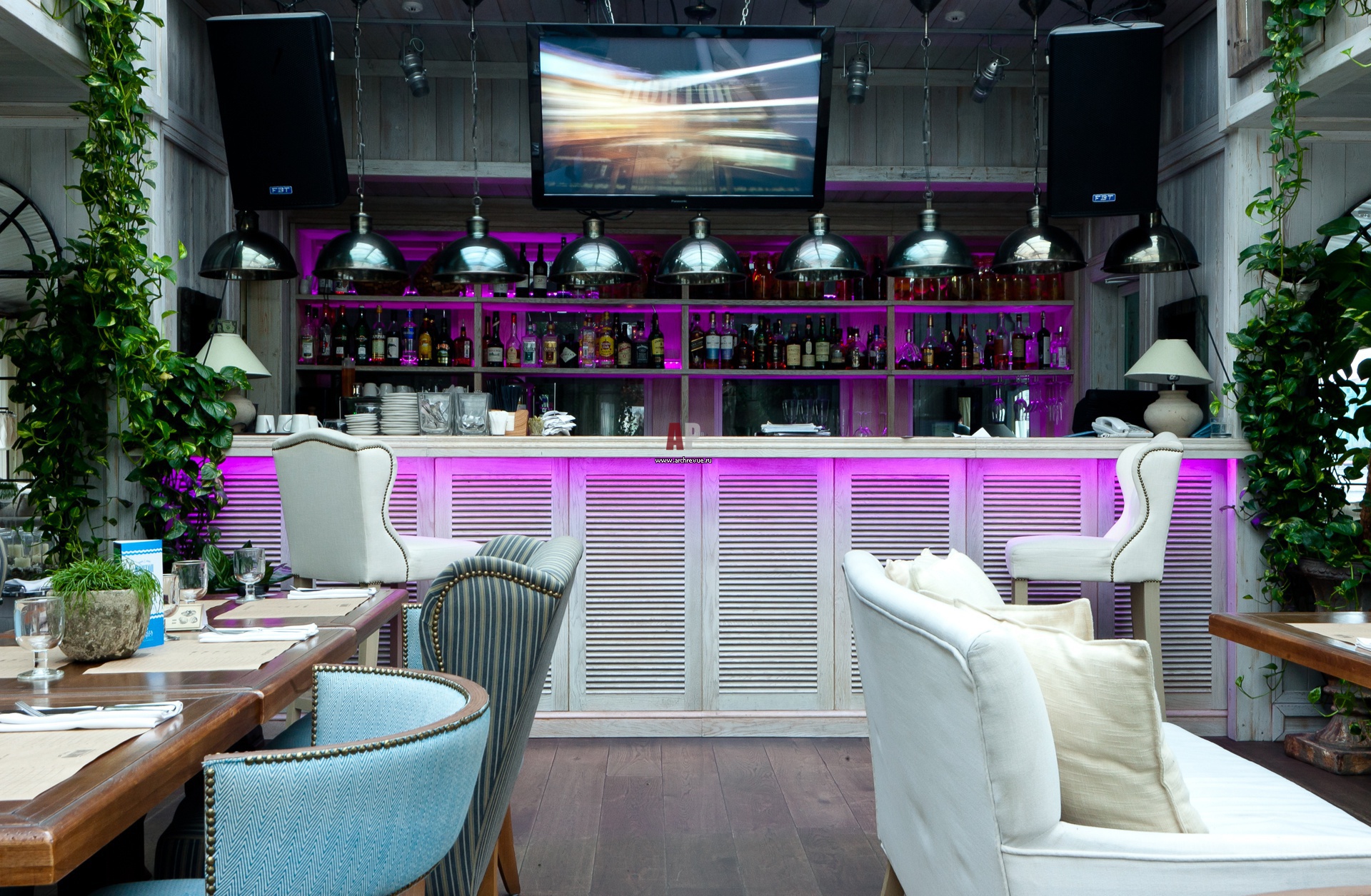 Оформление бара в яхтенном стиле. Неоновая подсветка придает интерьерам современный, клубный вид.