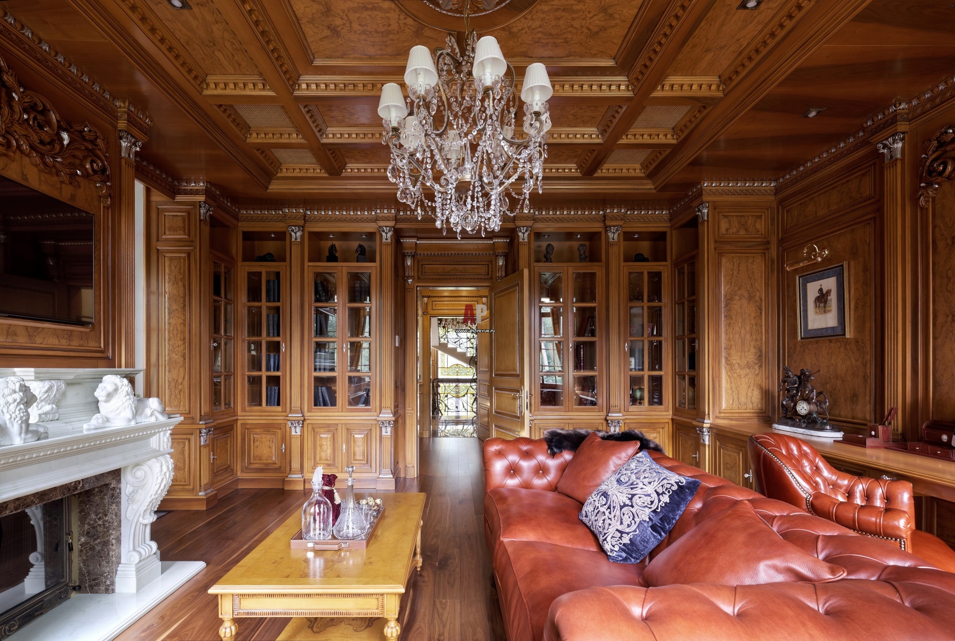 Интерьер кабинета в классическом стиле. В оформлении использовано древесина корня ореха красивого насыщенного медового цвета. Кожаный диван, Duresta. Люстра, Ralph Lauren.