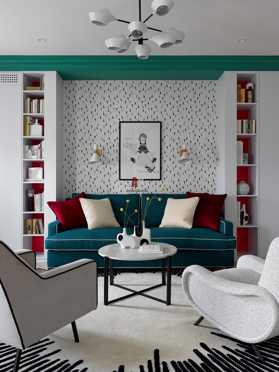 Неправильная форма детской помогла ее оптимально зонировать и выделить зону для сна отдыха и приготовления школьных уроков. По периметру размещены встроенные шкафы. Диван, Dantone Home. Белое кресло, Cassina. Бра, Visual Comfort & Co. Над диваном – графика художницы Алены Шкермонтовой.