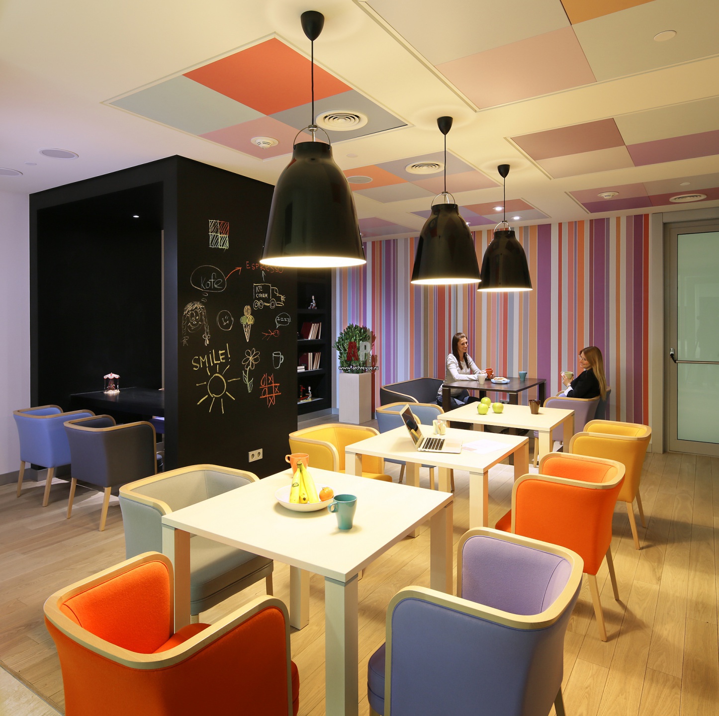 Фото интерьера столовой в офисе крупной компании, выдержанного в яркой цветовой гамме. Обои в полоску, мебель насыщенных лиловых, сиреневых и оранжевых тонах, поддержанных разноцветными квадратами на полке, создают позитивный настрой.