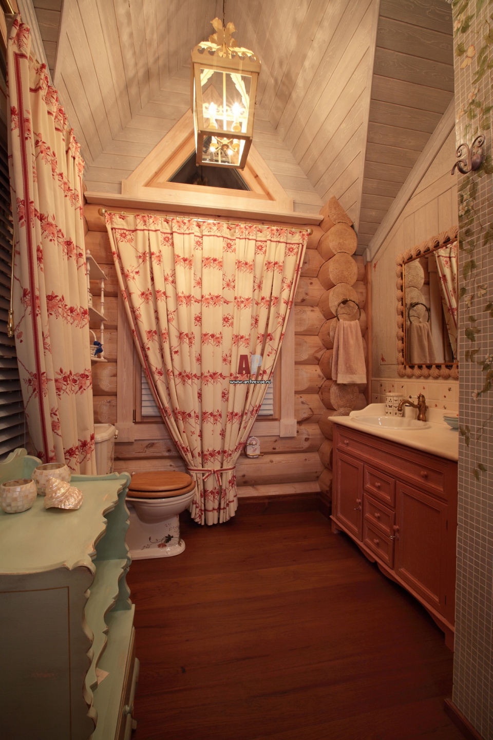 Дизайн ванной в русском стиле. Стены – открытая бревенчатая кладка. Унитаз украшен росписью, поставщик «Интерьерный салон» («Биг Бен»).