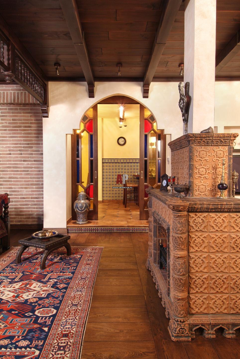 Кухня, расположенная в глубокой нише и приподнятая на подиум, отделена от гостиной раздвижными витражными панелями. Когда они раздвинуты, кухня интегрирована в общую зону.