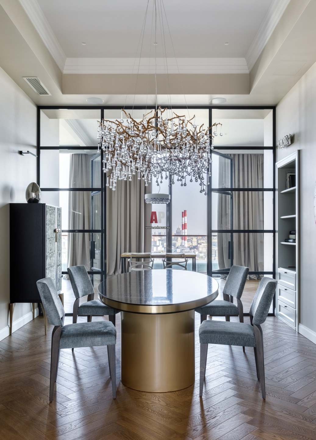Дизайнер предложила впустить небо внутрь и создать пространство, которое работает на просвет. Для этого выстроила анфилады, которые пересекаются друг с другом и создают интересные перспективы. В центре объема, на пересечении осей находится парадная столовая.