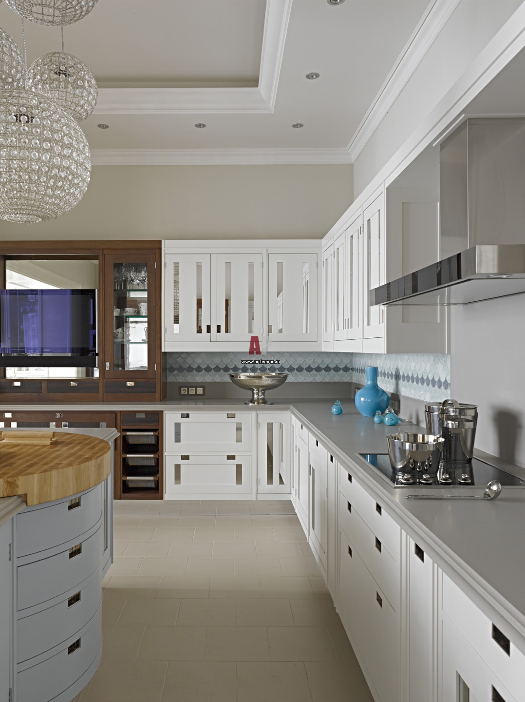 Дизайн кухни с мотивами ар-деко. Белые кухонные фасады украшены геометричными зеркальными вставками. Стены оформлены сине-голубой стеклянной мозаикой Vetro Vivo со сказочными волнами. Все – поставщик Charles.Cameron.
