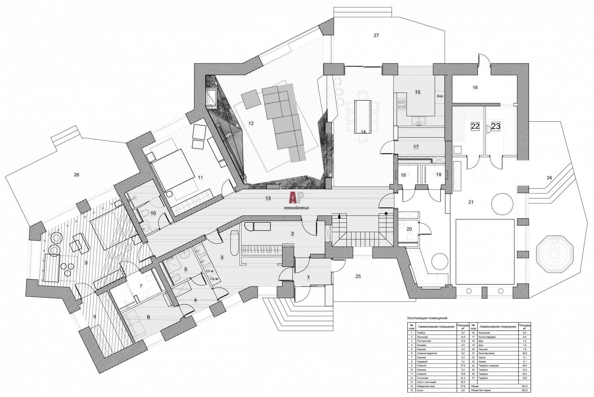 План первого этажа двухэтажного дома со сложной планировкой. Общая площадь – 600 кв. м.
