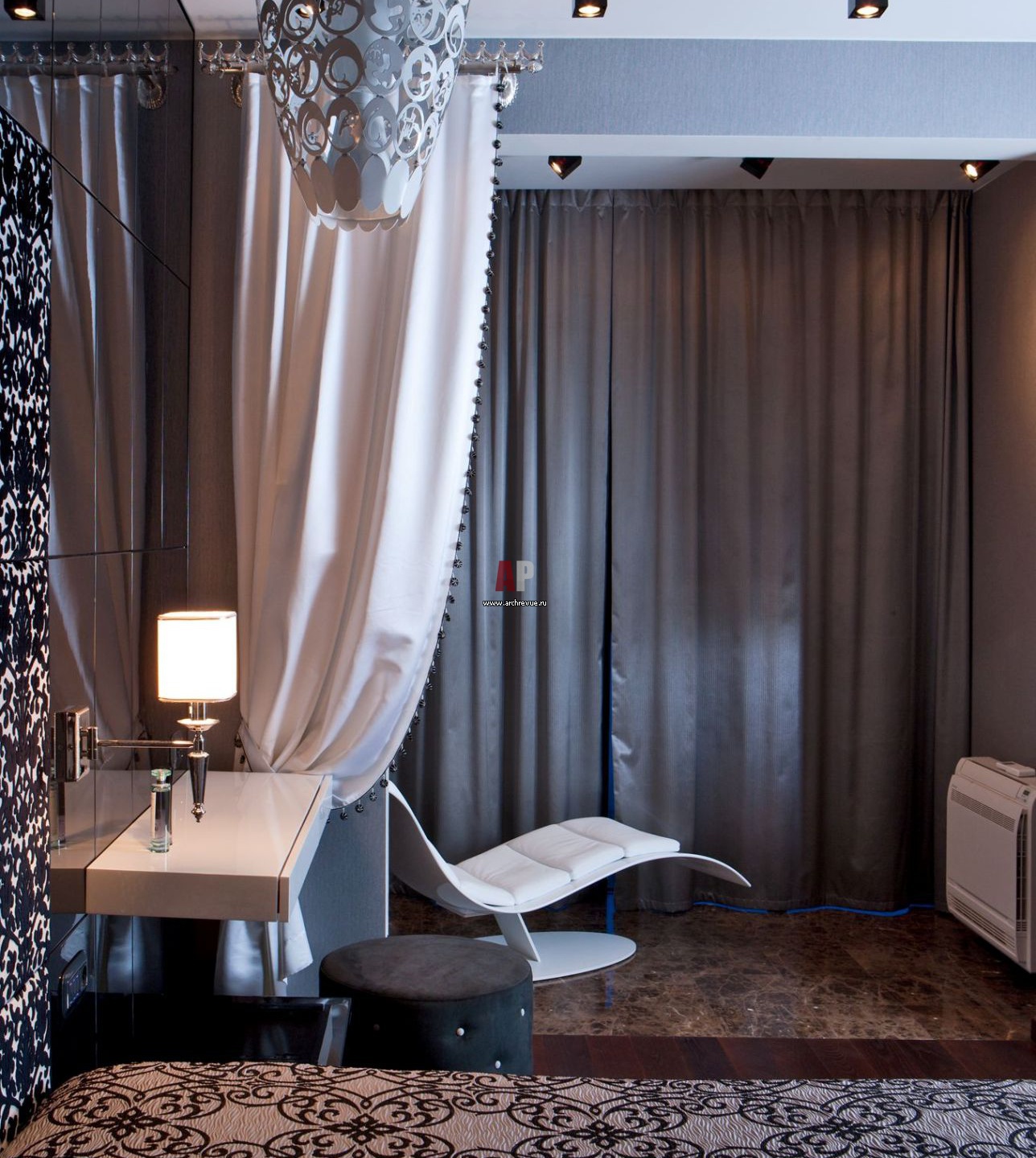 На утепленном и присоединенном балконе в спальне разместилась зона для релакса. На полах – мрамор, поставщик «Империя каминов ».