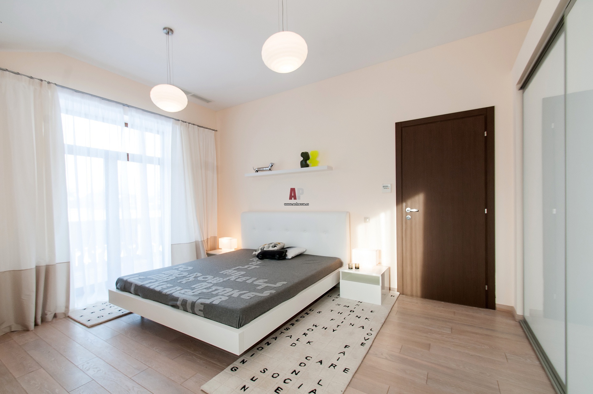 На фото – светлая современная спальня. С полами из выбеленного дуба и белыми стенами контрастируют двери из тонированного венге.