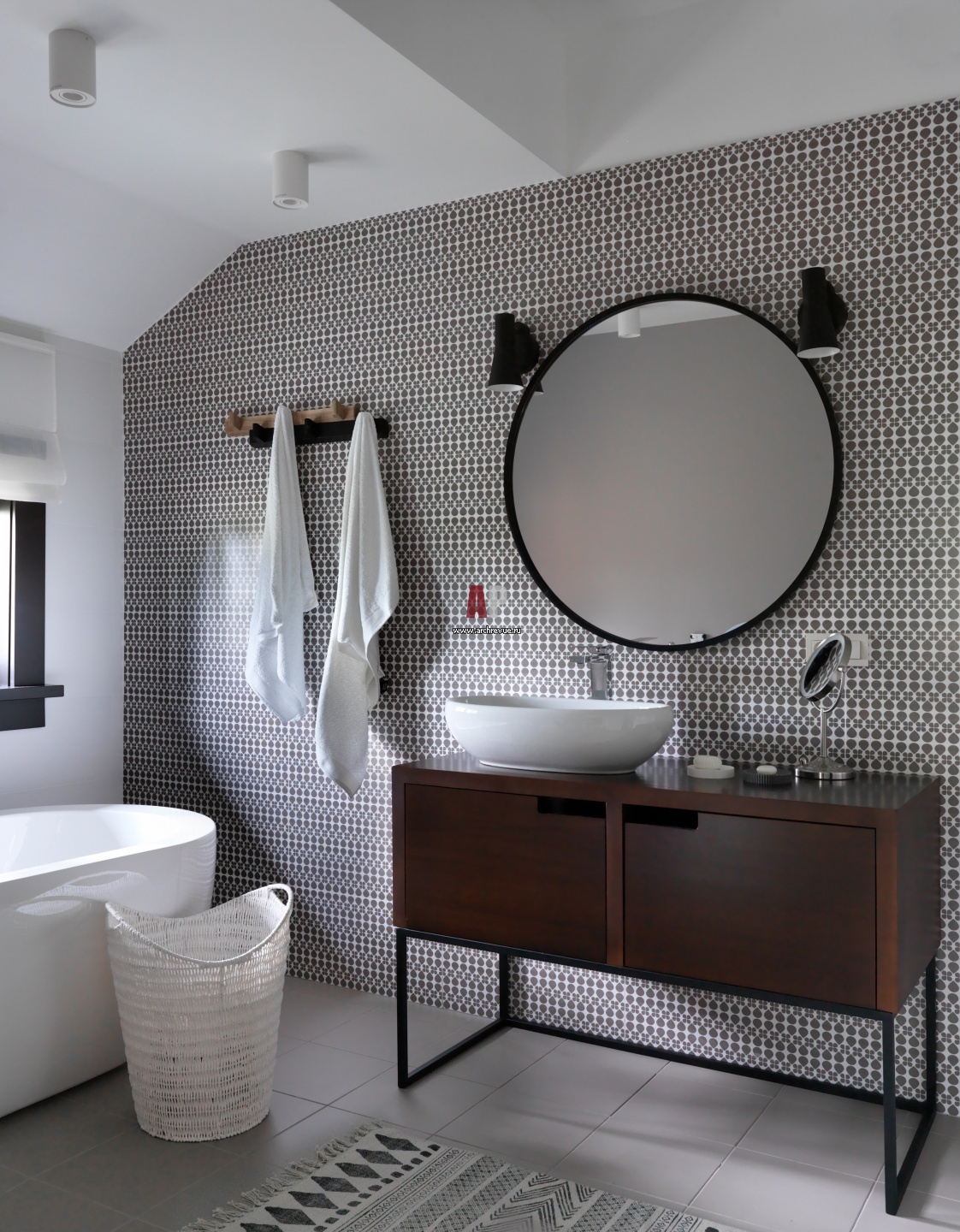Интерьер ванной комнаты на втором этаже. Стены облицованы черно-белой плиткой, Imola, коллекция Mush-up. Тумба по раковину, на заказ, изготовление fineobjects.