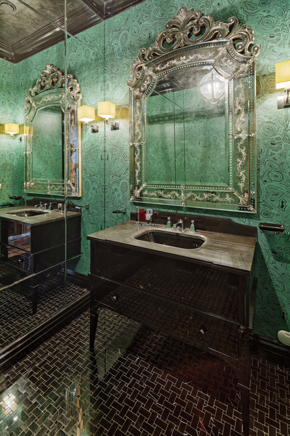 Стены в гостевом санузле оформлены обоями, имитирующими уральский малахит.