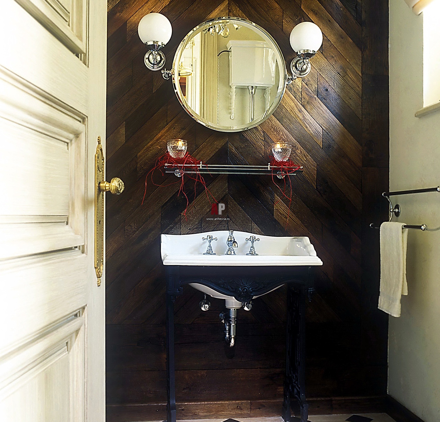 Стена гостевого санузла отделана французским дубовым паркетом XIX века. Двери выкрашены так, будто их уже несколько раз перекрашивали. На них явственно видны следы от кисти.