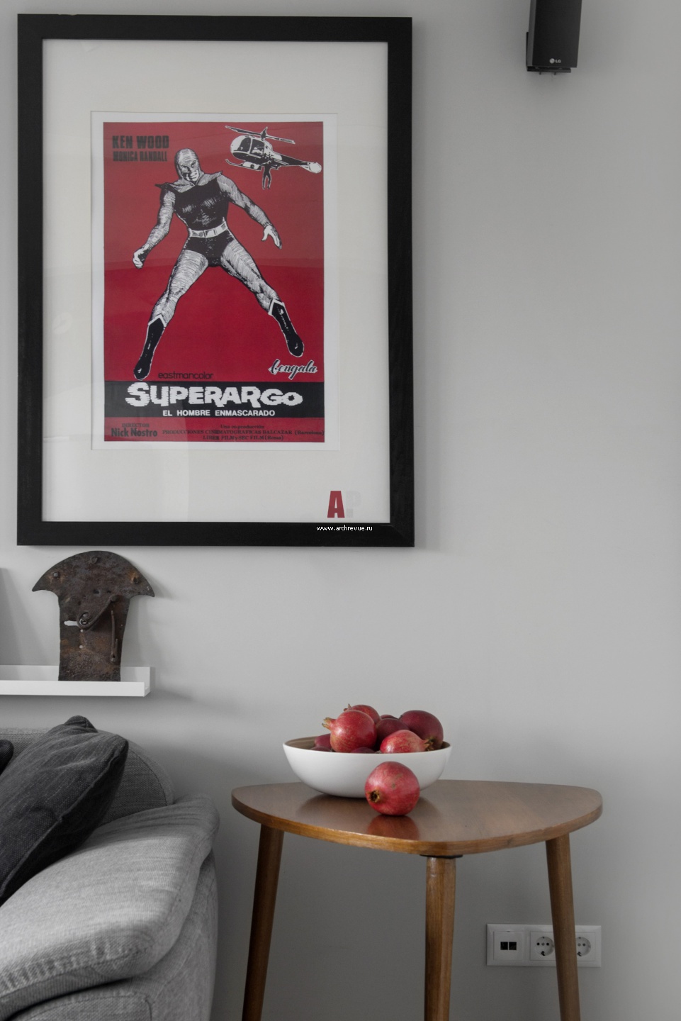 Фото мужского интерьера с деревянной мебелью в стиле 60-х и яркими ретро-киноафишами.
