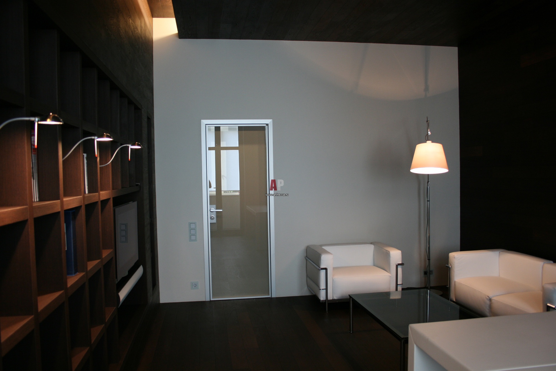 Кабинет весь зашит деревом: массив доски словно обнимает помещение, поднимаясь с пола на стену и потолок.