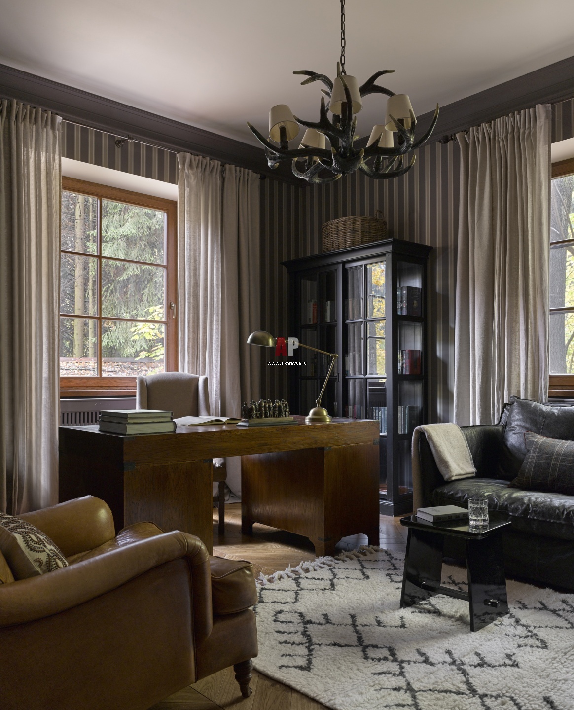Кабинет на первом этаже. В отличие от большинства комнат, стены в которых выкрашены краской, здесь использованы обои Farrow & Ball в полоску. Письменный стол, Eichholtz. Шкаф, WonderWood. Маленький столик, Zara Home. Кресло, Flamant.