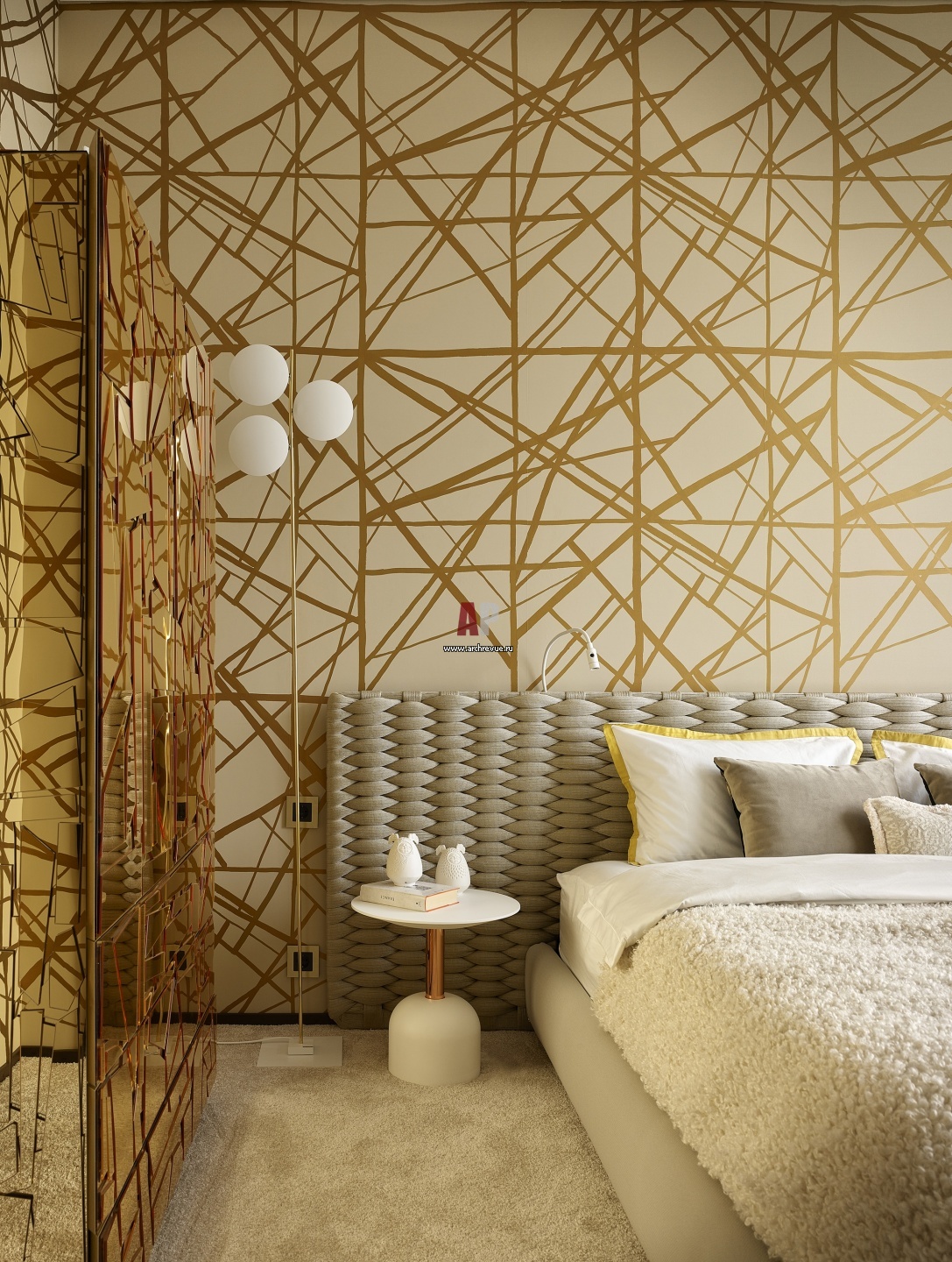 Комната дочери. Стены декорированы золотыми обоями с активным геометрическим рисунком, Kelly Wearstler. Столик, Miniforms. Торшер, Cattelan Italia.