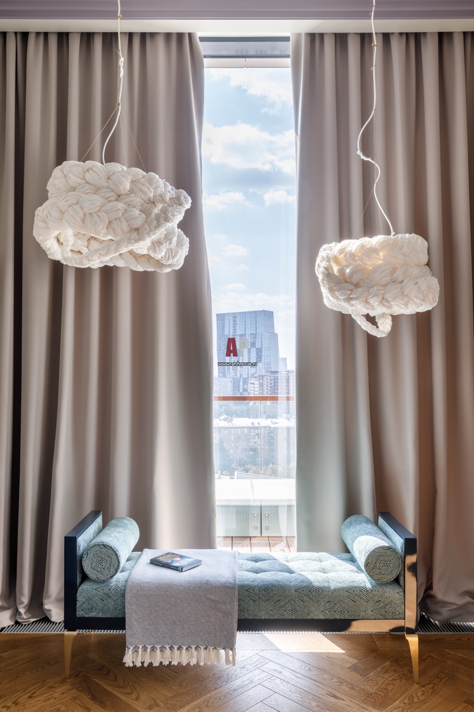 Светлый пентхаус цвета московского неба. Детская спальня. Светильники-косы из бумаги, Mammalampa (Латвия).