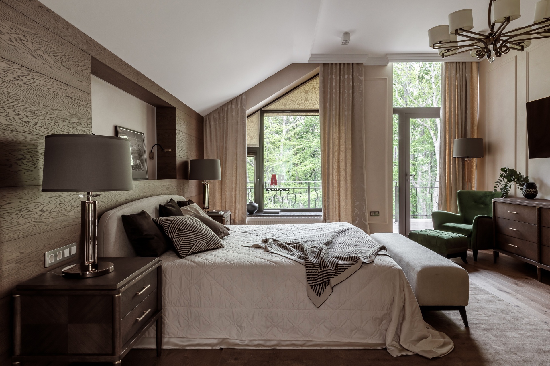 Главная спальня на втором этаже. Кровать, Estetica. Прикроватные столики, комод, Dantone Home.