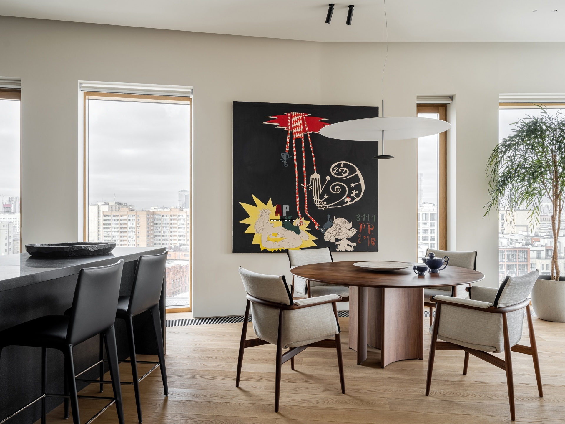 Акцент столовой зоны – картина «Воскрешение Пабло Пикассо» Павла Пепперштейна. Стол, Porada. Стулья, Carl Hansen & Son.