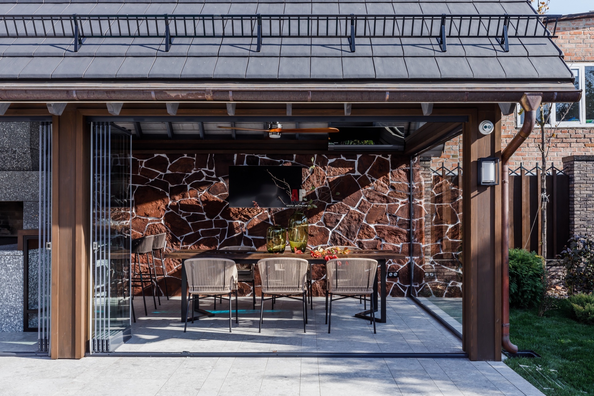 Одна стена в беседке облицована красным колотым камнем, другая сделана прозрачной. Использованы стеклянные витражи, Schuco.