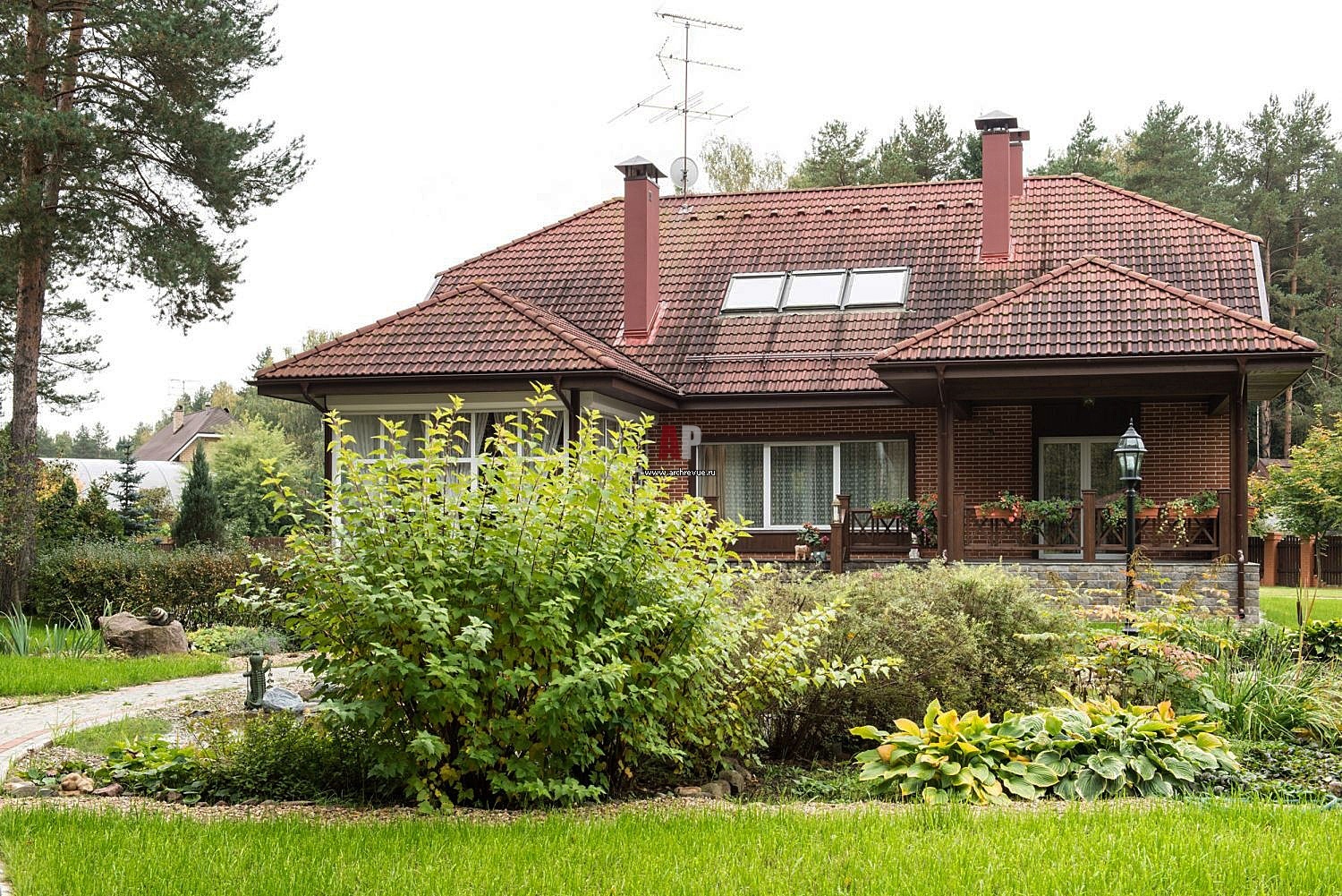 Двухэтажный дом из красного кирпича с большими летними террасами оформлен в стиле альпийского шале.