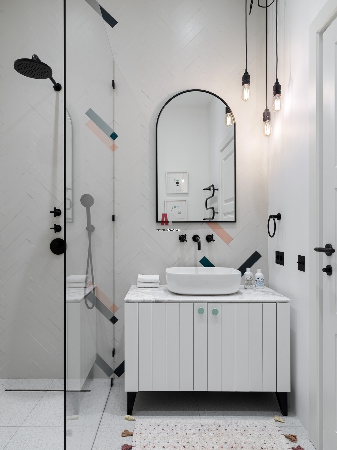 Детский санузел оформлен в монохромной палитре с элементами супрематизма.