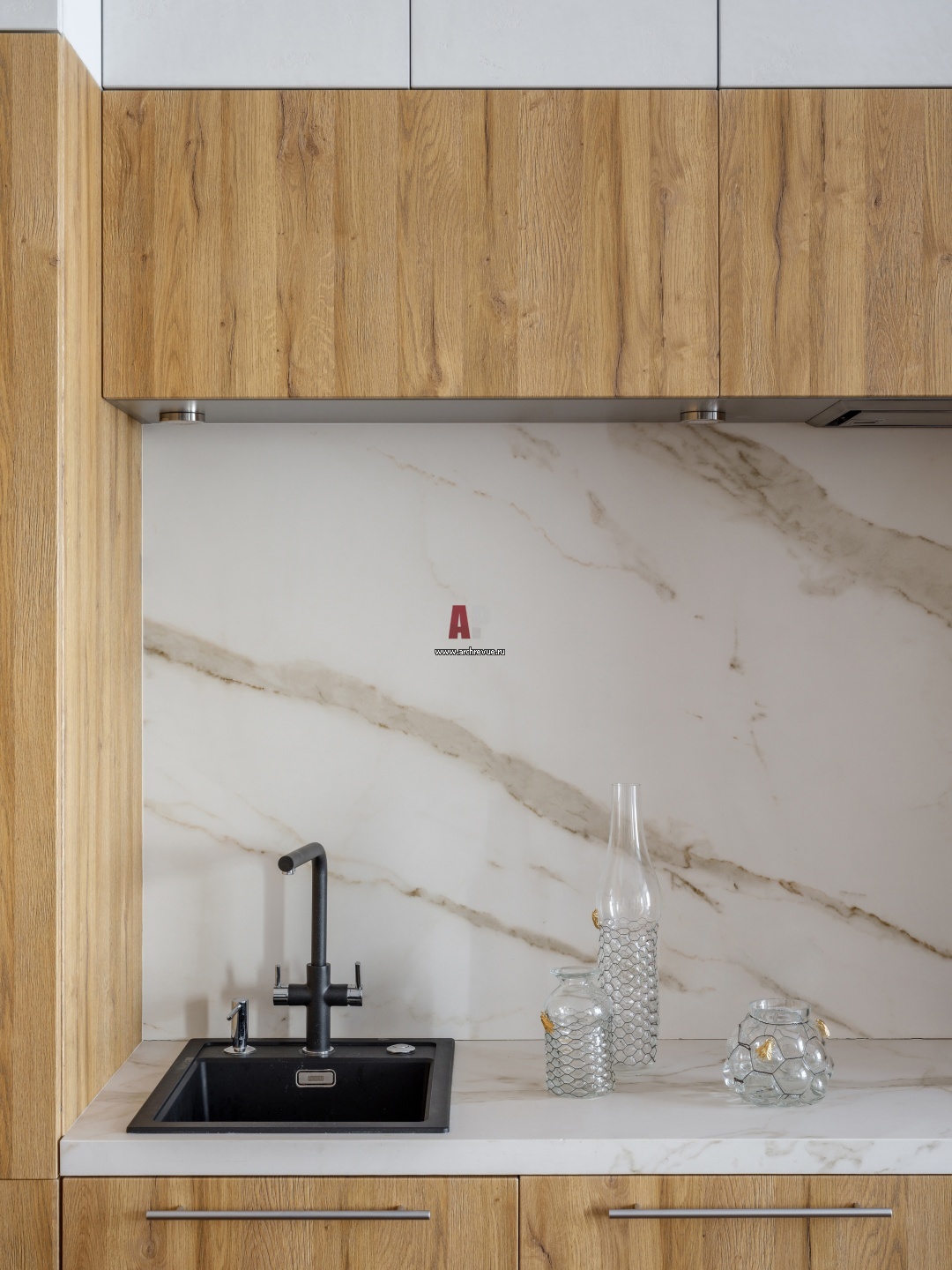 Интерьер кухни оформлен в стиле минимализм. Фартук и кухонный остров отделаны крупноформатным керамогранитом под мрамор. Черная кухонная мойка, Franke.