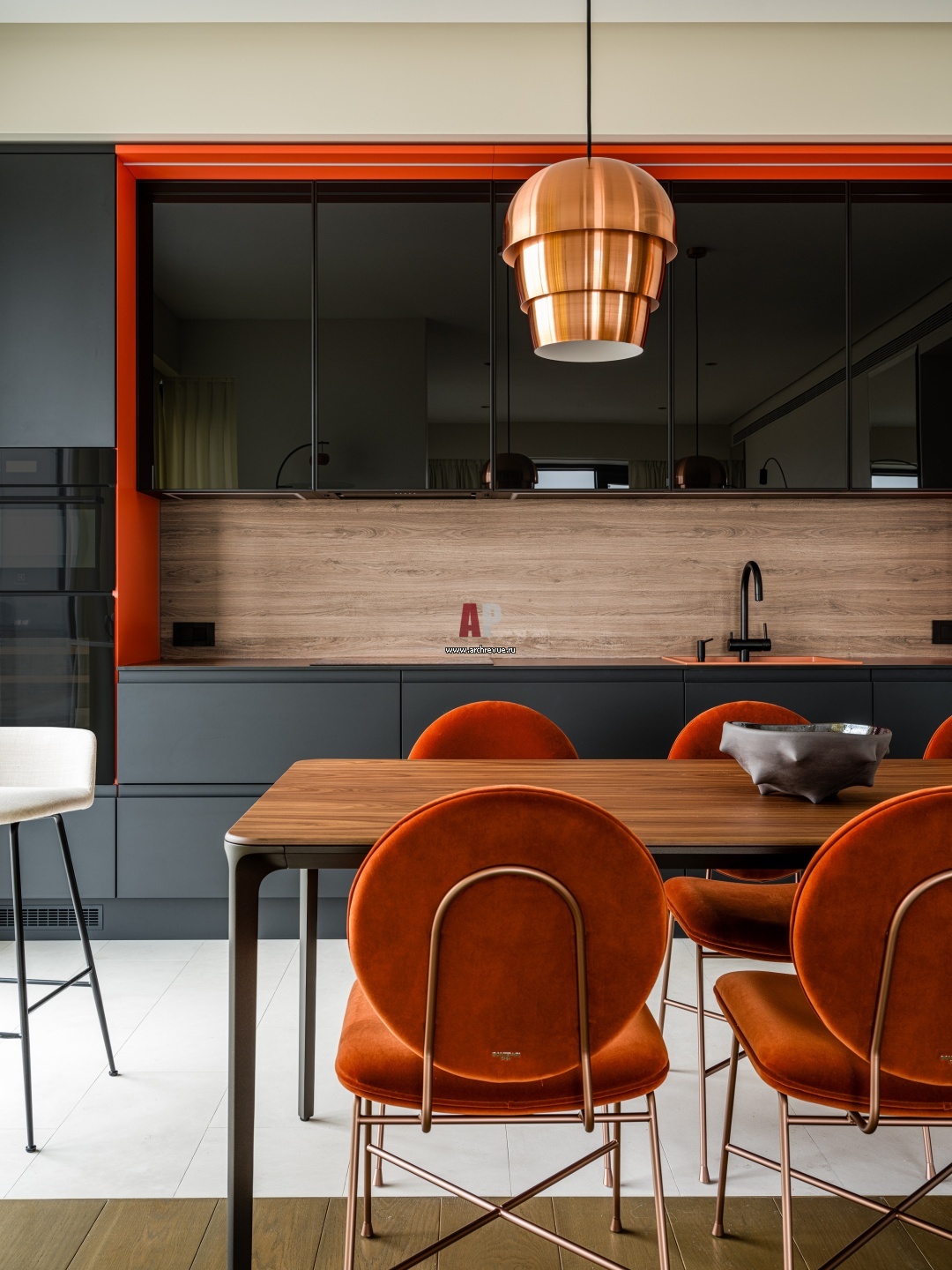 Отправной точкой проекта стали медные светильники BoConcept над столом. Откосы шкафов кухонного гарнитура окрашены в лососевый цвет. С ним сочетается глубокий черный и шпон ореха на столе и кухонном фартуке