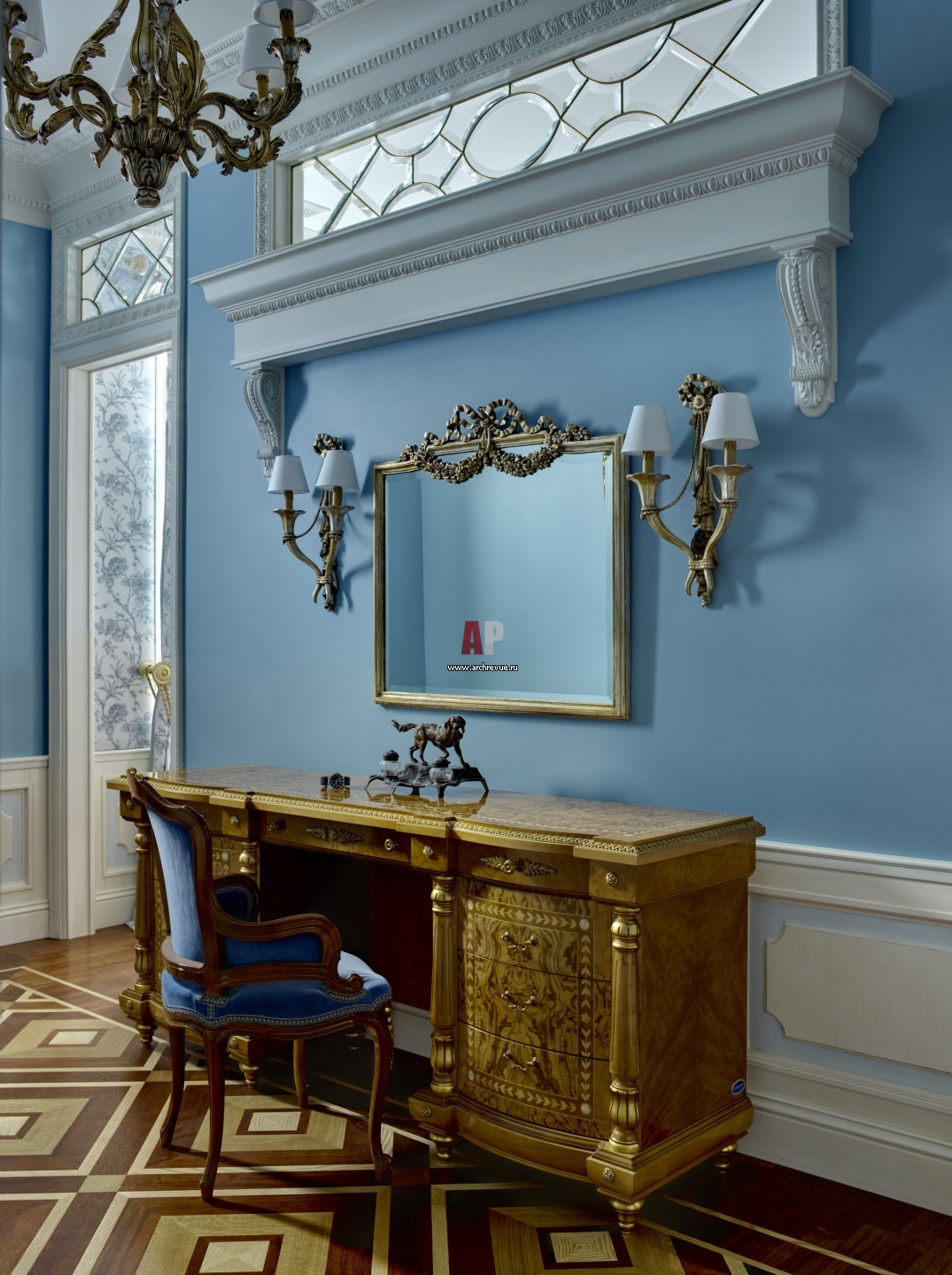 Будуар при спальне. Туалетный столик, Emergroup. Стул антикварный, отреставрированный. Зеркало, люстра, бра, Chelini.