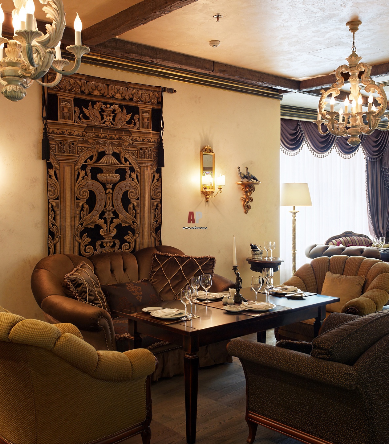 В зале ресторана спроектировано несколько функциональных зон: обеденная, барная, сигарная и зона отдыха.